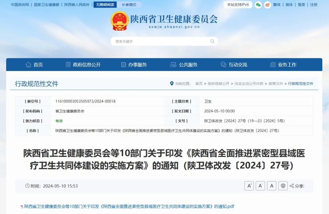 《陕西省全面推进紧密型县域医疗卫生共同体建设的实施方案》印发发表时间:2024-05-31 09:41 来源:陕西省卫生健康委员会网站 ![]() 陕西省全面推进紧密型 县域医疗卫生共同体建设的实施方案 一、科学构建县域医共体 ( 一)明确建设范围。纳入县域经济发展统计口径的 83 个县(市、区);涉农(含镇卫生院、村卫生室,下同)的市辖区、城市新区(高新区)可根据实际开展紧密型县域医共体建设,涉农且无县级公立医院的示范区、城市新区可与区域内的市级及以上公立医院开展建设。 (二)合理布局数量。综合考虑地理位置、服务人口数量和变化趋势、现有医疗卫生机构的数量、布局和能力等因素合理确定县域医共体建设数量。可按常住人口 20 万以下(含 20 万)的 县(市、区)组建 1 个,常住人口 20 万-40 万的县(市、区)组 建 1-2 个,常住人口40 万以上的县(市、区)可组建 2 个。 (三)成员单位构成。由县级医疗卫生机构(县人民医院、 县中医医院、县妇幼保健院等)、基层医疗卫生机构(含镇卫生院、社区卫生中心)组成。牵头医院一般应为二级及以上非营利性综合医院或中医医院。鼓励有条件的县级中医医院牵头组建县域医共体。鼓励引导社会力量办医疗机构根据自愿原则,以业务同质化管理和加强乡村服务为重点,加入县域医共体。 (四)落实功能定位。成员单位原有机构设置、机构名称、法人资格、职工身份、政府投入方式、资产属性原则上保持不变。成员单位按照功能定位,以医疗资源下沉为重点,协同开展医疗卫生服务。鼓励有条件的县(市、区)组建健康共同体总院,为 人民群众提供全方位、生命全周期的健康服务。 1.牵头医院。负责县域医共体内人、财、物等统一管理,完善医疗卫生机构运行机制,组织开展分级诊疗服务。建立重大事项报备制度,按有关组织程序进行人事任免。强化内部管理,加强重点临床专科建设,指导帮助成员单位提升服务和管理能力,规范服务行为,推进同质化进程。承担县域内常见病、多发病的诊治任务,急危重症抢救和复杂疑难病症转诊服务。派驻管理团队和医务人员,培训培养成员单位卫生技术人员,指导做好医疗、康复、预防保健等业务技术工作,接收成员单位的转诊。开展传染病预防诊治和管理、健康教育,进行防病指导。承担政府指定的紧急救治、救灾、支农、对口支援、疫情防治等指令性任务。县妇幼保健院按职责牵头负责辖区妇幼健康服务管理。 2.镇卫生院(社区卫生服务中心) 。承担辖区内基本医疗、公共卫生服务,做好双向转诊和下转病人治疗、康复服务,规范家庭医生签约服务;开展村医培训、推广适宜技术,合理调配乡村服务资源,推进乡村一体化管理。 3.村卫生室(社区卫生服务站)。承担与其功能相适应的基本医疗服务、家庭医生签约服务,以及疾病防控、健康教育等基本公共卫生服务。 成员单位一般命名为:“××县医共体总院”“××县医共体+县级机构名称+分院”“××县医共体+××镇+分院”;组建2个以上医共体时,命名为“××县+牵头医院名称+医共体总院” “牵头医院名称+医共体+乡镇名+分院”。组建健康共同体时, 参照上述方式命名。 二、健全管理制度 (五)完善政策措施体系。厘清建设权责利关系,制定政府办医、行业监管、县域医共体运行三张权责清单,实行清单化管理。以县级为单位制定完善具体建设细则,主要包括工作目标、实施步骤、建设内容、保障措施等内容,涉及到省市级部门职能权限的, 由相应的部门出台支持政策或经其同意后执行。 (六)推进医防融合防治结合。加强县域医共体与专业公共卫生机构协作,鼓励组建县级医疗机构医师牵头、专业公共卫生机构(疾病预防控制中心)和镇村两级医务人员参与、以县域医共体为单位的健康管理责任医师团队。建立健全疾控监督员制度,鼓励专业公共卫生机构参与县域医共体管理和服务,对县域医共体公共卫生工作进行监督管理。 (七)强化城乡联动和乡村一体化。加强县域医共体与城市医院的合作,探索制定帮扶成效考核机制,采取以奖代补方式,支持人员长期派驻工作。推进胸痛、卒中、创伤、急救、危重孕 产妇和新生儿救治“五大中心”下延基层医疗机构。实施县域医共体内科室共建项目,实现共建共享。开展面向乡村的巡回医疗,实现由基层医疗卫生机构全覆盖向服务全覆盖转变。建立巡回诊疗、派驻服务等考核评价机制。 三、推行紧密型运行模式 (八)优化内部管理。完善内部决策机制,依托县域医共体牵头医院现有科室,统筹成员单位资源,合理建立人力资源、财务管理、医疗质控等管理中心,提高各类资源配置和使用效率,推进同质化进程,提升建设成效。 1.人力资源中心。推进构建符合自身特点、体现医务人员知 识价值的薪酬分配体系,统筹开展县域医共体内人才规划、人员招聘、岗位设置、职称聘任、人员调配和绩效评价等工作。 2.财务管理中心。承担会计核算、预算管理、成本管理、资产管理、价格管理、会计监督和内部控制等财务管理职能。 3.药品管理中心。组建中心药房,统一负责药品耗材带量采购、协调配送、调配使用、使用指导,推进药事管理、合理用药、药品质量等制度执行。 4.健康管理中心。负责公共卫生项目实施、指导、督导、培训、考核;制定公共卫生服务项目实施方案和绩效考核方案;对各