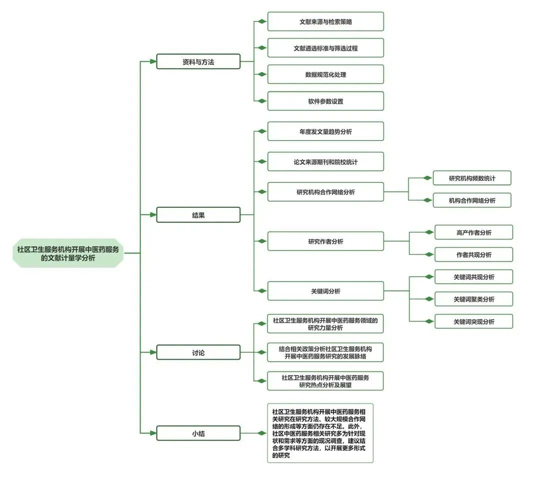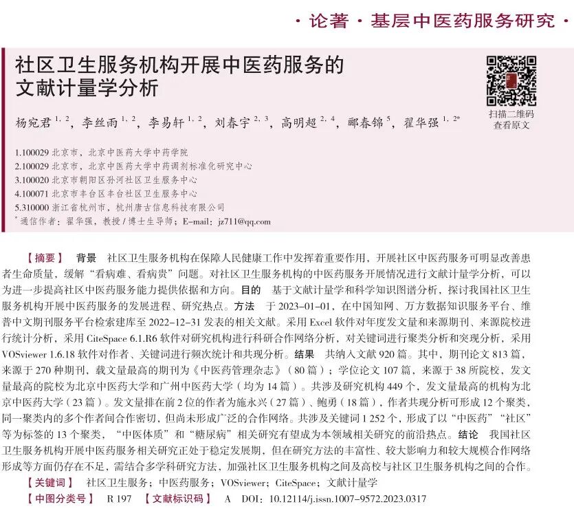 社区卫生服务机构是服务于社区、家庭和居民的非营利性医疗机构,以妇女、儿童、老年人、慢性病患者、残疾者和贫困居民为重点服务人群,具有开展健康教育、预防、保健、康复及常见病和多发病诊疗服务等方面的功能,是基层卫生服务体系的重要组成部分。将中医药应用于医疗卫生服务对防治突发公共卫生事件、防治重大疑难疾病及防治慢性病等方面有重要价值,且有利于缓解“看病难、看病贵”问题。在社区卫生服务机构开展中医药服务具有完善卫生服务体系、构建和谐社会等方面的重要意义,开展相关领域研究也有助于提高社区卫生服务机构的服务能力。前期针对社区中医药服务发展现状的文献计量学分析有联合采用Excel软件和NoteExpress软件分析的研究,但缺乏结合科学知识图谱(mapping knowledge domains,MKD)进行可视化分析的研究。MKD是一种显示科学知识发展进程与结构关系的图形,有着“一图展春秋,一览无余;一图胜万言,一目了然”的特征。VOSviewer和CiteSpace软件可用于MKD的绘制:前者在处理文献信息方面有强大的功能,可实现对文献中作者、关键词等不同术语单元的分析,并可构建知识网络;后者则对研究领域有着解释与预见功能,其对研究领域趋势、热点和前沿分析结果的准确性在与领域专家的合作中得到了验证。 在此背景下,北京中医药大学翟华强教授团队带领北京市朝阳区孙河社区卫生服务中心刘春宇副院长、北京市丰台区丰台社区卫生服务中心医院高明超副主任医师,联合杭州唐古信息科技有限公司创始人郦春锦等,基于文献计量学分析方法与CiteSpace、VOSviewer软件的可视化分析技术,对我国社区卫生服务机构开展中医药服务相关研究进行频数分析和MKD绘制,以了解本领域相关研究的发展进程及演变,进而揭示社区卫生服务机构开展中医药服务相关研究的热点与前沿,为社区卫生服务工作者开展社区中医药服务研究、提高社区卫生服务机构中医药服务能力提供参考。