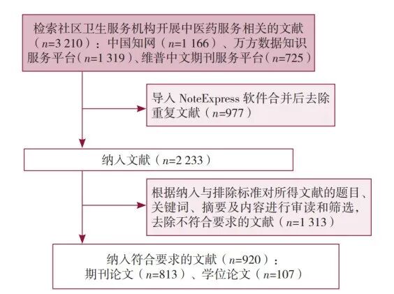 图1 社区卫生服务机构开展中医药服务的文献计量学分析 (注:根据文献内容整理) 一、资料与方法 1.1 文献来源与检索策略 于2023-01-01,系统检索中国知网、万方数据知识服务平台、维普中文期刊服务平台,以获取我国社区卫生服务机构开展中医药服务相关研究,设置文献检索时间为建库至2022-12-31。 1.2 文献遴选标准与筛选过程 文献纳入标准:为社区卫生服务机构开展中医药服务相关的文献,如对社区卫生服务中心(站)的中医药服务资源/中医药服务能力等展开的调研、中医适宜技术等中医药服务在社区卫生服务机构的应用等研究。排除标准:(1)仅与“社区卫生服务机构”或“中医药服务”二者之一相关的文献;(2)对某一社区卫生服务机构的介绍、对某人的访谈、会议介绍及召开通知、新闻报道、公报、相关政策法规及其解读等;(3)对国外社区卫生服务机构中医药服务展开的相关研究;(4)重复及关键词、作者等信息不全的文献。 采用Excel软件进行统计分析,将检索到的文献题录使用NoteExpress软件合并后去除重复论文,由3位研究者按纳入与排除标准对所得文献的题目、关键词、摘要及内容进行审读和筛选,如遇分歧则与第4位作者共同审读、讨论,以判断是否纳入论文,最终得到文献920篇,其中期刊论文813篇、学位论文107篇。文献筛选流程见图2。