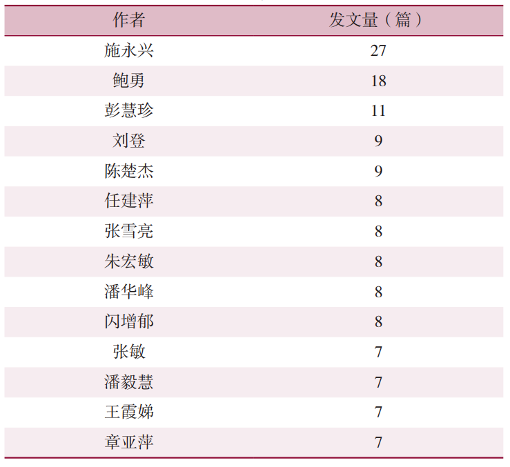 图7 社区卫生服务机构开展中医药服务相关文献的研究机构合作网络图 2.4 研究作者分析 2.4.1 高产作者分析 纳入文献共涉及作者1933位。普莱斯定律计算得到M=3.89,故在本研究中发文量≥4篇的作者为核心作者候选人,前15位的作者见图8。