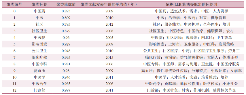 图12 社区卫生服务机构开展中医药服务相关文献的关键词共现网络密度视图 2.5.3 关键词聚类分析 采用CiteSpace软件进行关键词聚类分析,见图13。