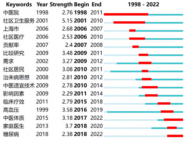 图14 社区卫生服务机构开展中医药服务相关文献的关键词时间线图 2.5.4 关键词突现分析 共得到16个突现词,“中医院”是最早出现的突现词,且持续13年。持续到2022年的突现词为“中医体质”“糖尿病”,见图15。