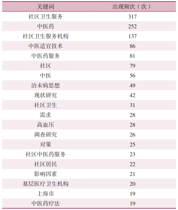 图9 社区卫生服务机构开展中医药服务相关文献的作者共现网络叠加视图 2.5 关键词共现分析 2.5.1 高产作者分析 纳入文献共涉及1252个关键词,出现频次排在前20位的关键词见图10。