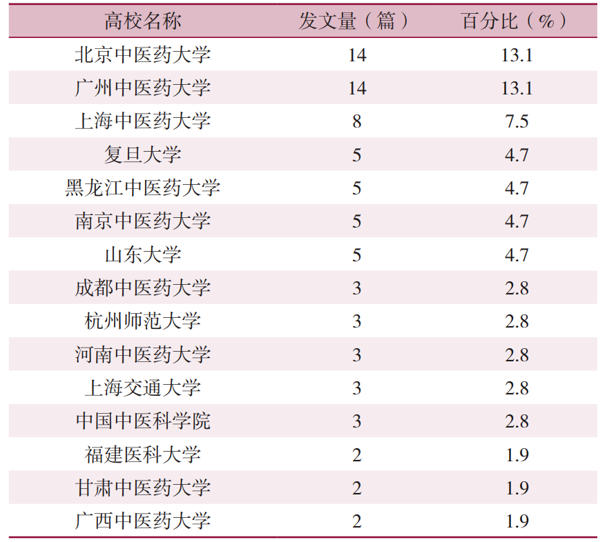 图4 社区卫生服务机构开展中医药服务相关 813 篇期刊论文的来源期刊分布(前15位) (2)纳入的107篇学位论文来源于38所院校,发文量最高的院校为北京中医药大学和广州中医药大学(均为14篇)。发文量排在前15位的院校见图5。