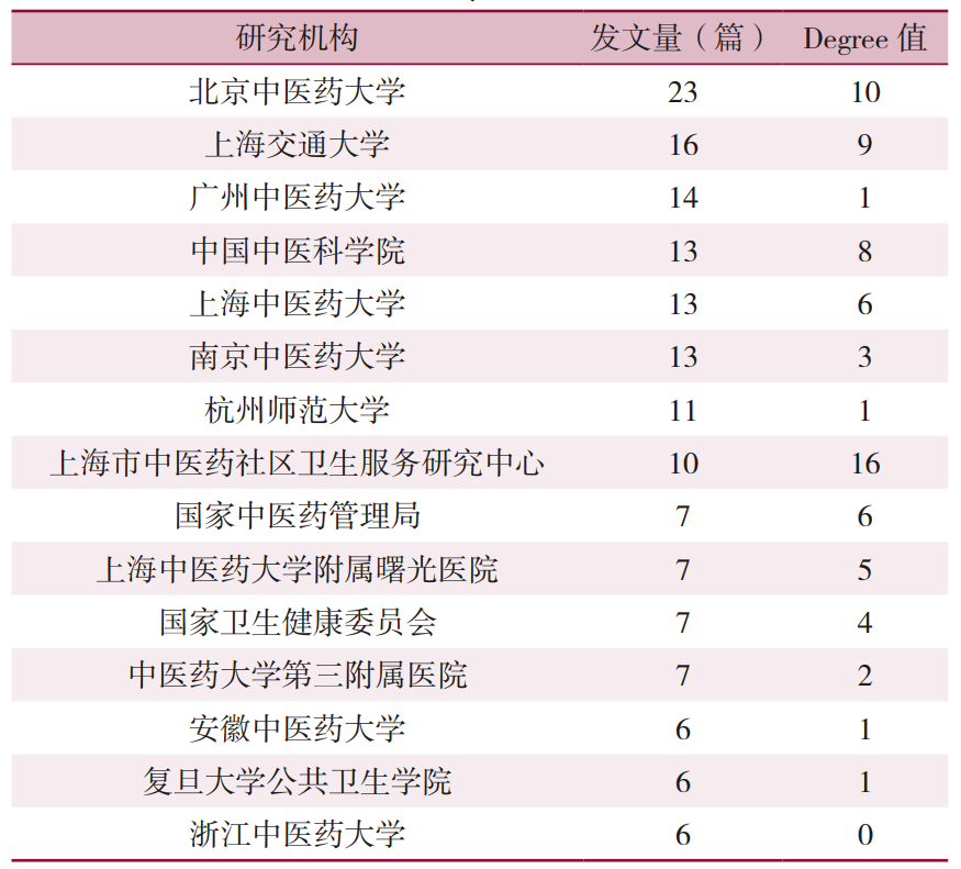 图5 社区卫生服务机构开展中医药服务相关107篇学位论文的来源高校分布(前15位) 2.3 中药调剂信息化智能化需发展适合基层推广的新业态 2.3.1 研究机构频数统计 共涉及研究机构449个,发文量排在前3位的机构依次为北京中医药大学(23篇)、上海交通大学(16篇)、广州中医药大学(14篇)。依据Degree值,中心性排在前3位的机构依次为上海市中医药社区卫生服务研究中心(16)、北京中医药大学(10)、上海交通大学(9),见图6。