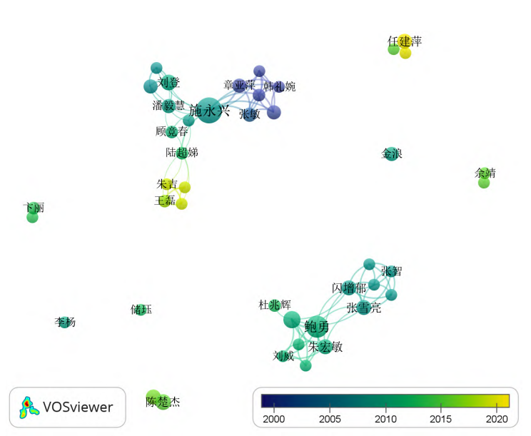 图8 社区卫生服务机构开展中医药服务相关文献发文量排在前15位的作者 2.4.2 作者共现分析 在VOSviewer1.6.18中进行作者共现分析,对发文量>5篇的43位作者进行合作网络分析,见图9(图中节点大小代表了作者的发文量)。