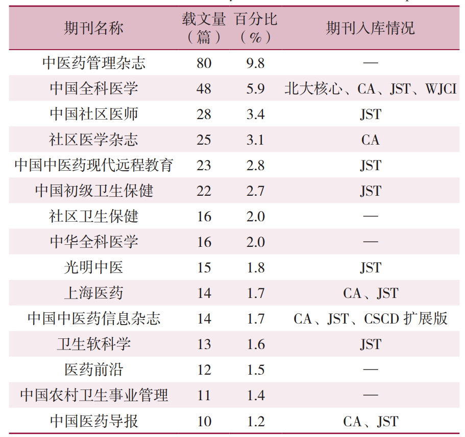 图3 1998—2022 年社区卫生服务机构开展中医药服务相关文献的年度发文量 2.2 论文来源期刊和院校统计 (1)纳入的813篇期刊论文来源于270种期刊,载文量排在前15位的期刊见图4。
