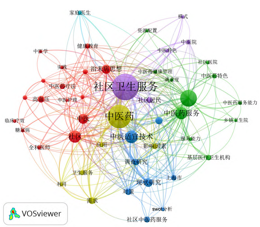 图10 社区卫生服务机构开展中医药服务相关文献的关键词分布(前20位) 2.5.2 关键词共现分析 采用VOSviewer软件,对提取出的频次≥8 次的47个关键词进行共现网络分析,总连接强度为2430,见图11。