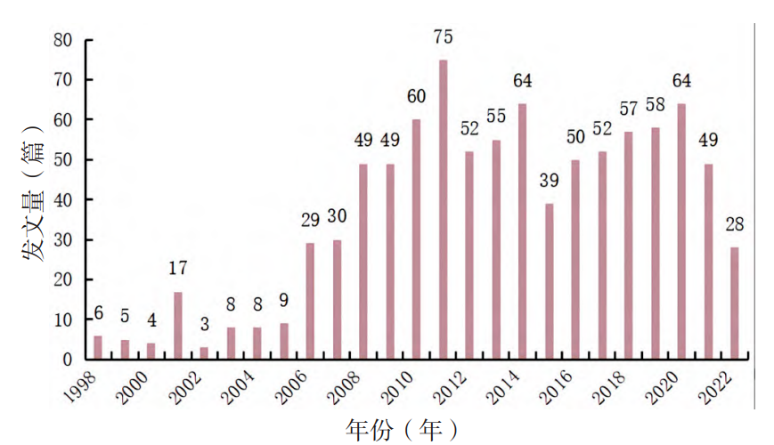图2 文献筛选流程图 1.3 数据规范化处理 对同一研究机构的不同名称或同一研究机构的不同院(系)、科室进行合并,如将北京中医药大学管理学院、北京中医药大学基础医学院等合并为北京中医药大学,但对于高等院校的不同附属医院则不予合并。对于关键词,将社区卫生服务中心与社区卫生服务站合并为社区卫生服务机构。此外,将具有相同含义的关键词进行合并,如将全科医生合并到全科医师。 1.4 软件参数设置 将所得文献的年度发文量、来源期刊、全部作者和机构等相关数据导入Microsoft Office Excel(16.0.15128.20128)进行统计分析。使用CiteSpace 6.1.R6 软件对研究机构进行科研合作网络分析,设置时间分区(Time Slicing)为1998—2022年,时间切片(Year Per Slice)选择1。在CiteSpace软件绘制的研究机构共现图谱中,节点越大,表明该机构的发文量越高;以度中心性(Degree)来描述网络中节点的特性,其值越大,表明该节点在网络中越重要;设置节点标签的大小与其度中心性的值呈正相关,节点间有连线则表明机构间有合作。对关键词进行聚类分析和突现分析。在关键词聚类分析中设置聚类标签词来源于关键词,标签提取算法采用对数似然率(log-likelihood rate,LLR)算法。使用VOSviewer 1.6.18对作者及关键词的出现频次进行统计,并进行共现网络分析,选择完整计数(Full Counting),设置作者最小发文量为5篇、关键词出现频次的阈值为8次。在VOSviewer软件绘制的关键词共现网络密度视图中,节点的密度越高、权重越大,则其颜色越亮,反之则其颜色越接近蓝绿色等冷色。 二、结果 2.1年度发文量趋势分析 本研究纳入的社区卫生服务机构开展中医药服务相关文献始发于1998年,1998—2005年为相关研究的起步阶段,平均发文量为7.5篇/年。发文量于2006年骤增,此后发文量逐年上升,至2011年达发文量高峰(75篇),在此期间平均发文量为48.7篇/年。2012—2020年整体发文趋势平缓,稳中有升,平均发文量为54.6篇/年。2021年开始年发文量有下降趋势(图3)。