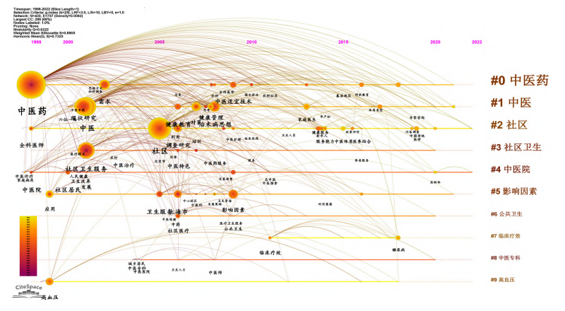 图13 社区卫生服务机构开展中医药服务相关文献的关键词聚类情况 将排在前10位的聚类在时间线上展开,可以发现,以“中医药”作为关键词的相关研究具有较好的延续性,与聚焦“需求”“中医适宜技术”等方面的研究有较大关联性,见图14。