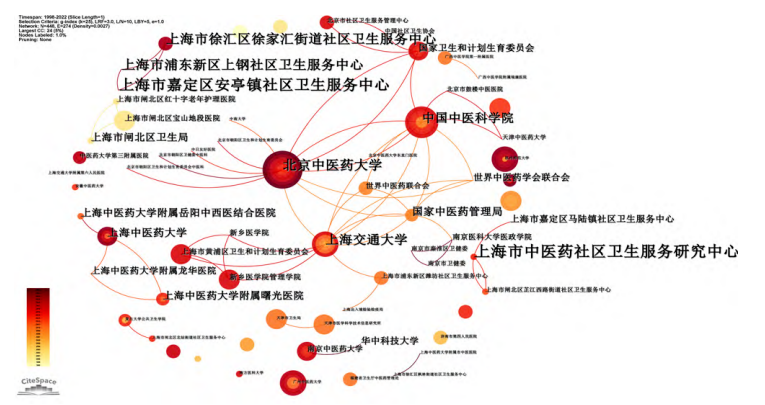 图6 社区卫生服务机构开展中医药服务相关文献的前15位发文机构及中心性 2.3.2 研究机构频数统计 使用CiteSpace软件绘制研究机构共现图谱,所得图谱共有节点448个,连线274条,网络密度为0.0027(图7)。