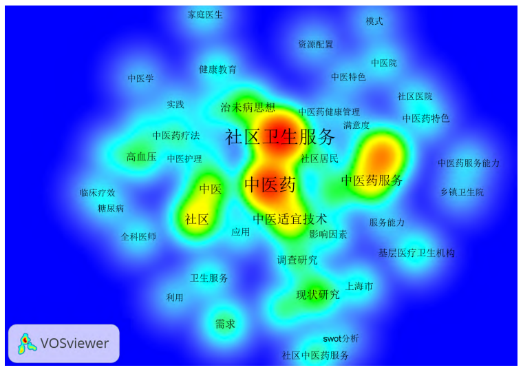 图11 社区卫生服务机构开展中医药服务相关文献的关键词共现网络视图 基于关键词共现网络中节点的密度进行可视化展示,见图12。
