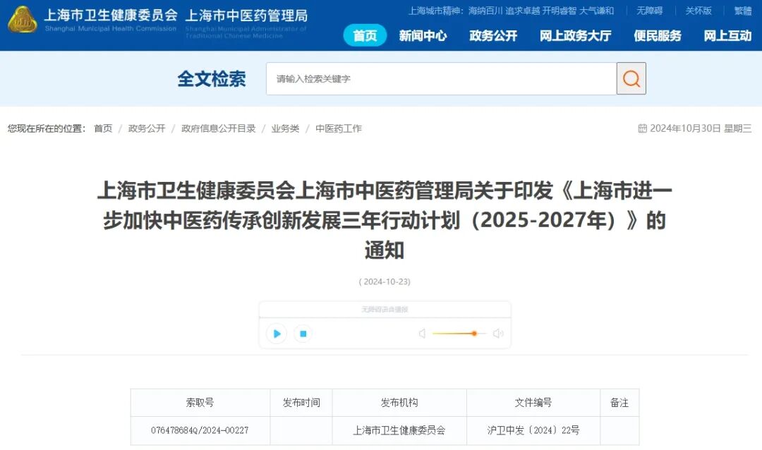 《上海市进一步加快中医药传承创新发展三年行动计划(2025-2027年)》发布发表时间:2024-10-31 11:01 来源:上海市卫健委官网 ![]() 各区人民政府,市政府各委、办、局: 上海市卫生健康委员会 上海市中医药管理局 2024年10月22日 上海市进一步加快中医药传承创新发展 三年行动计划(2025-2027年) 为贯彻落实《中共中央关于进一步全面深化改革、推进中国式现代化的决定》和《中共上海市委关于贯彻落实党的二十届三中全会精神,进一步全面深化改革、在推进中国式现代化中充分发挥龙头带头和示范引领作用的决定》提出的“完善中医药传承创新发展机制”精神,加快我市国家中医药综合改革示范区建设,在更高起点、更高层次、更高目标上推进中医药传承创新发展,特制订本行动计划。 一、行动目标 通过三年建设,我市中医药传承创新发展机制进一步完善,中医药在深化医药卫生体制改革、推动健康上海建设以及助力生物医药产业发展中的作用发挥更加明显,率先推出一批具有标志性、引领性的改革创新成果,为国家提升中医药治理体系和治理能力现代化水平提供改革示范和制度保障。到2027年,以高水平市级中医医疗机构为引领的覆盖全民和全生命周期的中医药服务体系更加完善,三级公立中医医院绩效考核成绩持续保持全国领先位置,社区中医药服务主阵地作用日益凸显。中医药临床优势和健康服务高地不断巩固,中西医结合发展水平和影响力不断提升,全国中医医院学科(专科)学术影响力排名前三的学科(专科)数量保持全国前列。中医药科技创新协同机制更趋成熟,中医药国际化高地地位更加凸显,本市主导发布的中医药国际标准占比保持全国前列。中医药领军人才群体集中涌现,中医药产业对生物医药产业的贡献度不断提升,市民中医药健康文化素养保持全国前列。 二、主要任务 (一)建设高水平的中医药服务体系 1.打造公立中医医院高质量发展模式样板。推进国家医学中心(中医类)和国家中西医结合医学中心创建,以解决重大临床问题、重大理论创新、重大技术突破、重大人才培育为目标,强化临床服务与科学研究双向联动、协同发展机制,突出政产学研用“五力联动”,打造具有国际影响力的智慧型、研究型中医医院。支持高水平中医医院建设公立中医医院高质量发展示范,进一步建立健全现代医院管理制度、创新服务模式、提高医院智慧化水平,综合实力持续保持国内领先。到2027年,制定不少于5个国家级中医、中西医结合临床指南,开展不少于3个医疗机构制剂或新药研发,形成一系列中医医院、中西医结合医院高质量发展创新示范。(责任部门:市卫生健康委、市中医药管理局、市发展改革委、市科委、市疾控局、申康医院发展中心等按职责分工负责) 2.强化区级中医类医院发展基础和服务能级。夯实区级中医医院发展基础,加快崇明、嘉定、徐汇等区级综合医院转型为中西医结合医院,实现每个区中医类医院全覆盖。实施区级中医类医院能级提升专项,加强区属中医类医院基本条件改造和设备更新,支持浦东新区、虹口、闵行、长宁、松江、嘉定、普陀、奉贤、黄浦等区属中医类医院新建或改扩建,在五大新城按照三级医院标准建设好一家中医医院,提升中医药资源短缺区域床位配置水平。发挥四大中医区域医联体辐射作用,鼓励有条件的区属中医类医院牵头紧密型医联体,加强区属中医类医院急诊科、老年科、儿科和康复科建设,开展区域医疗机构中医特色专科和中医药适宜技术推广中心建设,持续提升专科诊疗能力和区域龙头作用。到2027年,努力实现每个区级中医类医院建设至少2个中医特色专科和1个适宜技术推广中心。(责任部门:各区人民政府、市卫生健康委、市中医药管理局等按职责分工负责) 3.建设社区中医药服务主阵地。持续推动全国基层中医药工作示范区创建,全部社区卫生服务中心规范设置中医馆,加强内涵建设,推进中医药全面融入社区卫生服务一体化发展,筑牢社区中医药服务网底。在社区康复中心、护理中心和健康管理中心建设中积极发展中医药服务。开展社区中医医师康复技能培训和社区护理人员中医药知识和技能培训,支持社区全专结合中医药服务提供。建设中医巡诊社区卫生服务站、社区特色专病专科、上海市名中医工作室基层工作站,满足居民“最后一公里”高品质中医药服务需求。推进中医名医、名方、名技在社区卫生服务机构的应用,推动常见病、多发病中医药服务逐步实现社区卫生服务机构与上级医疗机构同质化。到2027年,全市各社区卫生服务中心平均能够提供60种以上中医基本病种的诊疗,开展不少于6类20项以上的中医医疗技术;推动30%的社区卫生服务站和村卫生室强化中医药服务场地建设,达到国家中医阁建设标准。(责任部门:各区人民政府、市卫生健康委、市中医药管理局等按职责分工负责) 4.完善功能互补、上下联动的中医药服务资源流动机制。深化“区域+专科”中医医联体建设,依托市级中医医院和各中医优势专科,下沉和技术支撑覆盖全市16个区,通过一体化诊疗服务、一体化学科建设、一体化人才培养,人才双聘、双向转诊、建设基层名中医工作室等措施,建立健全中医药服务要素梯度传递和双向流动机制。支持区级中医医院发挥中医药服务枢纽作用,重点打造一区一品牌,强化社